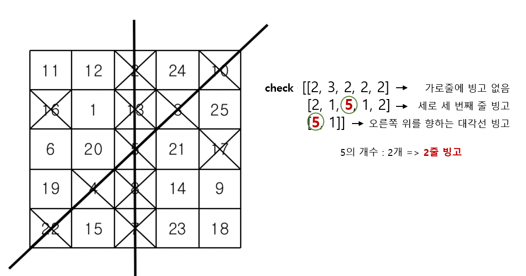 그 의미는 check 리스트에서 숫자 5가 되면 해당 줄에서 5개의 모든 수가 지워진 경우니까 한 줄 빙고가 되는 것이다.
