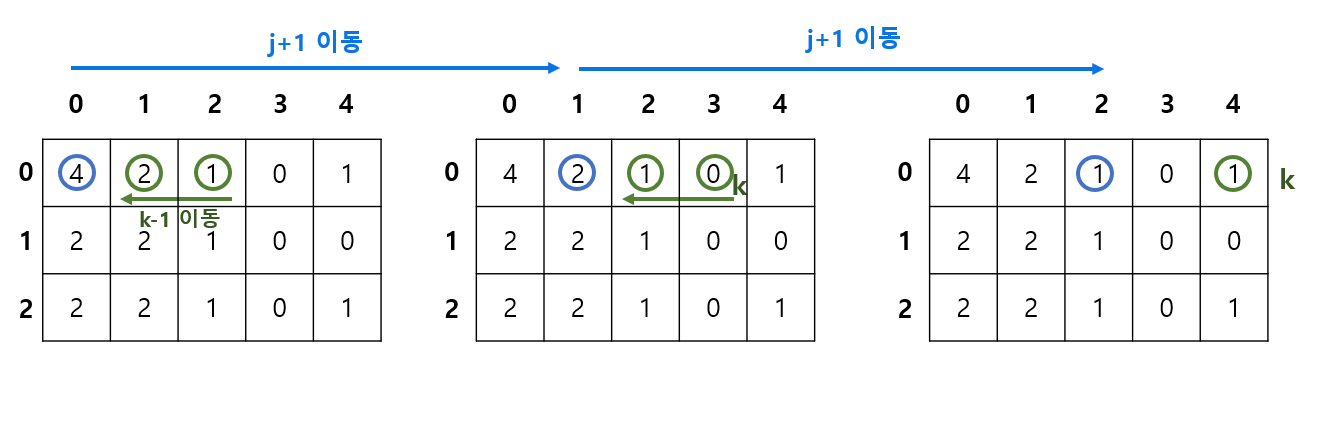 j는 0번 인덱스부터 오른쪽으로 움직이고 k는 min(j+a-1, b-1)부터 j+1까지 왼쪽으로 움직인다.