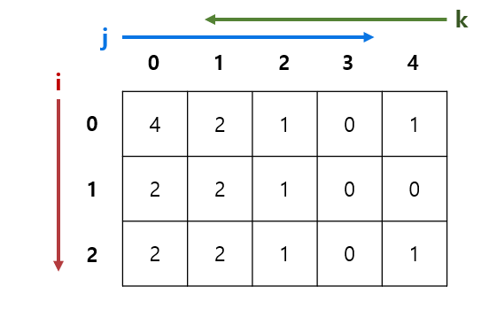 우선 같은 줄에서 같은 수를 찾기 위해 i를 고정해두고 j와 k를 비교한다. -> if c[i][j] == c[i][k]