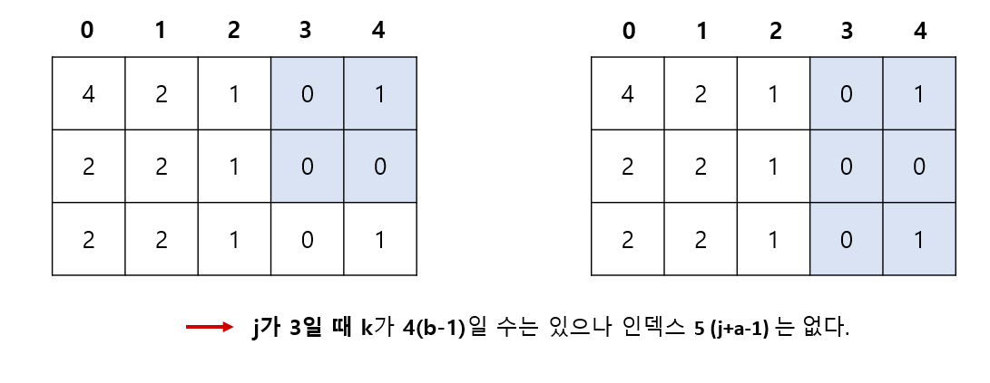 그림 min(j+a-1, b-1) 이유 2 처럼 j가 3일때 (j+a-1)는 5가 된다. 따라서 k의 range가 b-1부터 시작되어야만 한다.