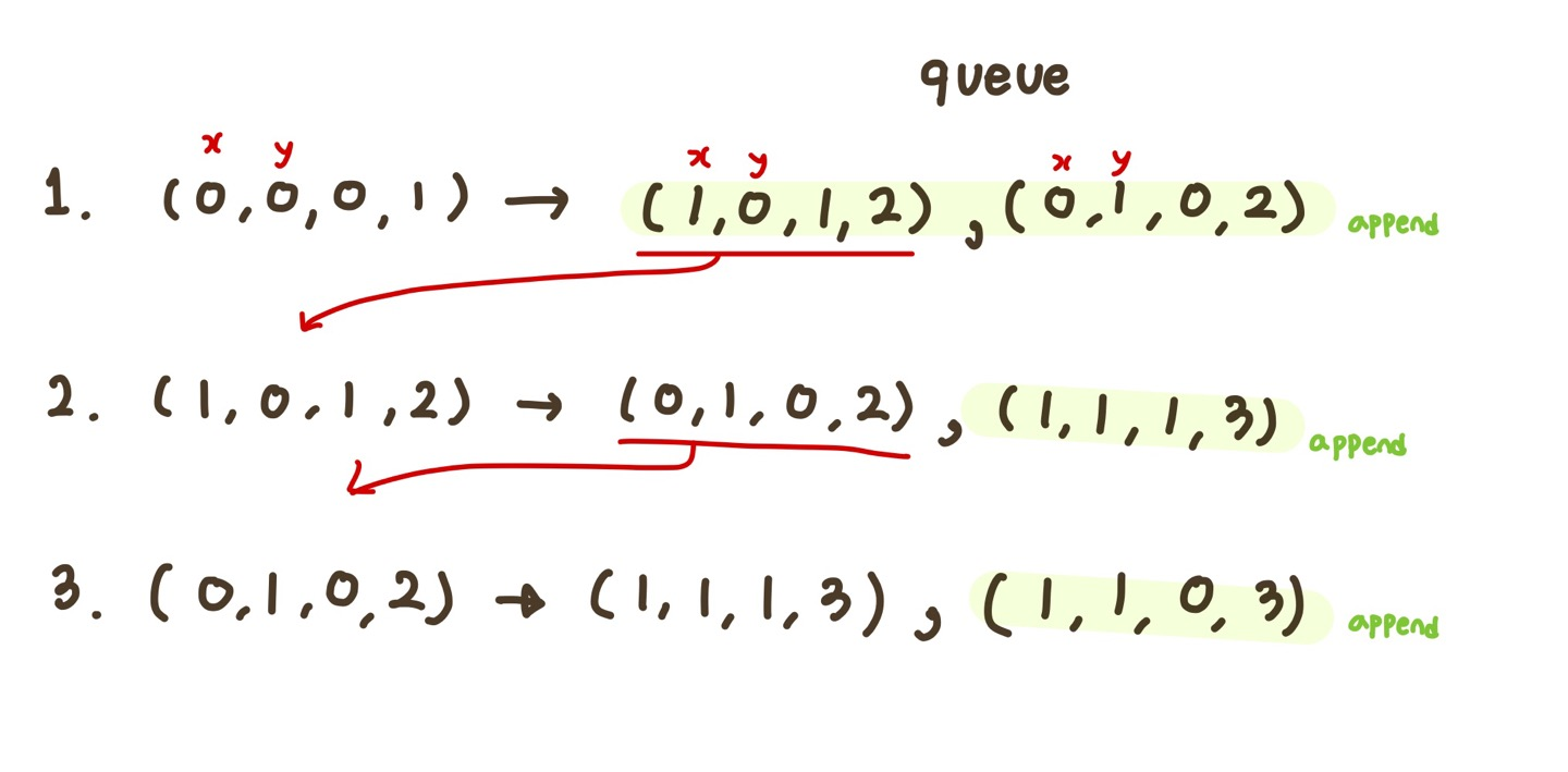 2) 큐의 첫번째 (1, 0, 1, 2)를 pop한 다음 해당좌표에서의 이동인 (1, 1, 1, 3)을 담는다.