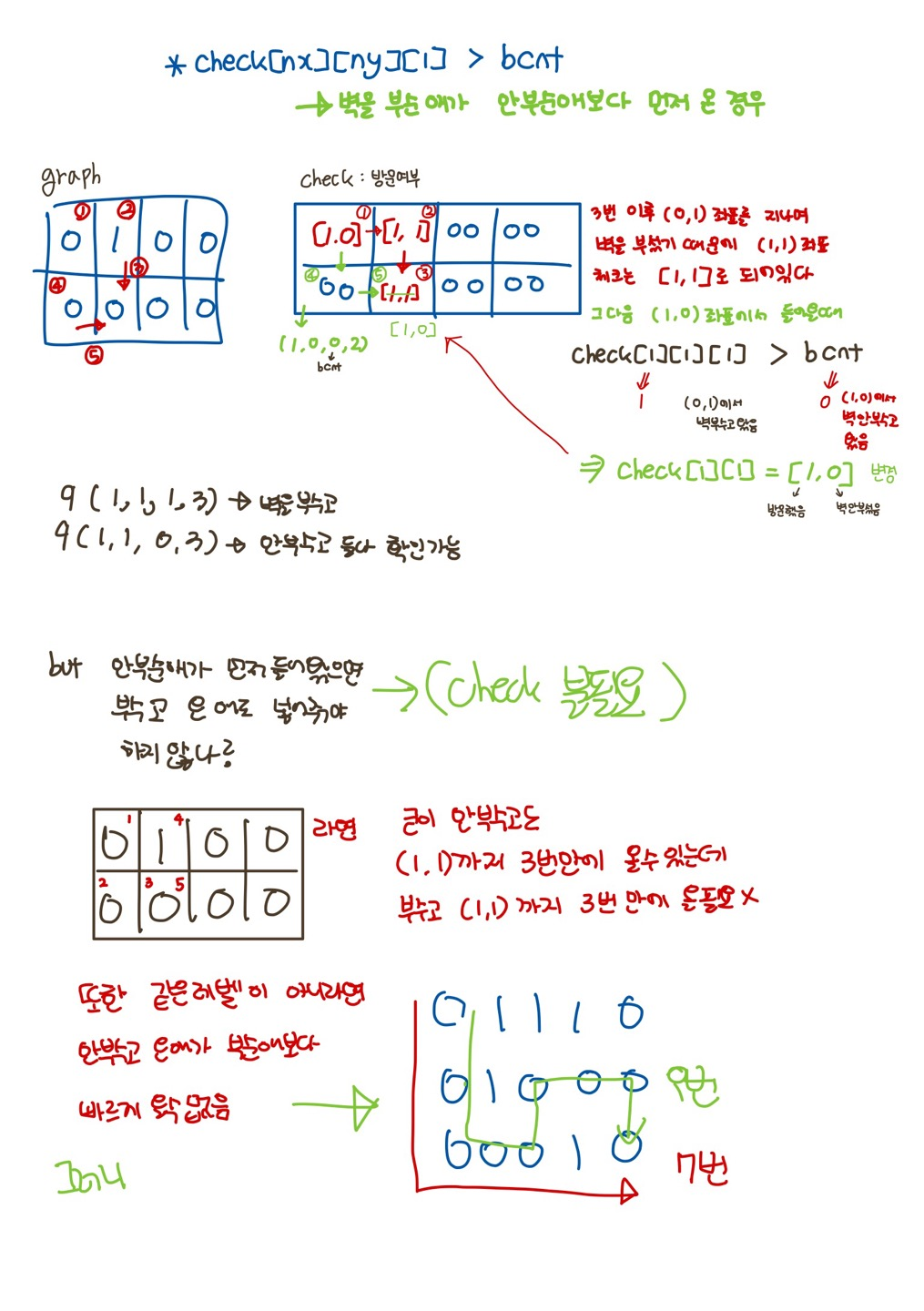 낙서 끄적인 수준이지만 그냥 벽을 부순애가 먼저 들어와서 queue안에 들어가고 난 후에도 벽을 안부순애가 그 위치에 방문한다면 queue에 들어갈 수 있게 해준 코드라는 의미 :)