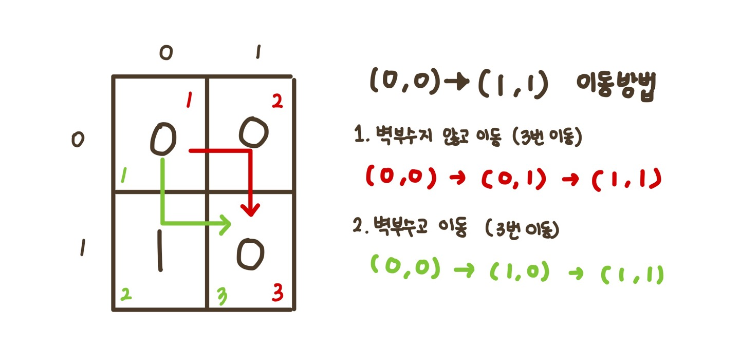 똑같이 3번 이동하는데 한 가지 경우는 벽을 부수고 이동하고 다른 한 가지 경우는 벽을 부수지 않고 이동하는 경우이다.