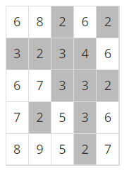 이제 위와 같은 지역에 많은 비가 내려서 높이가 4 이하인 모든 지점이 물에 잠겼다고 하자. 이 경우에 물에 잠기는 지점을 회색으로 표시하면 다음과 같다.